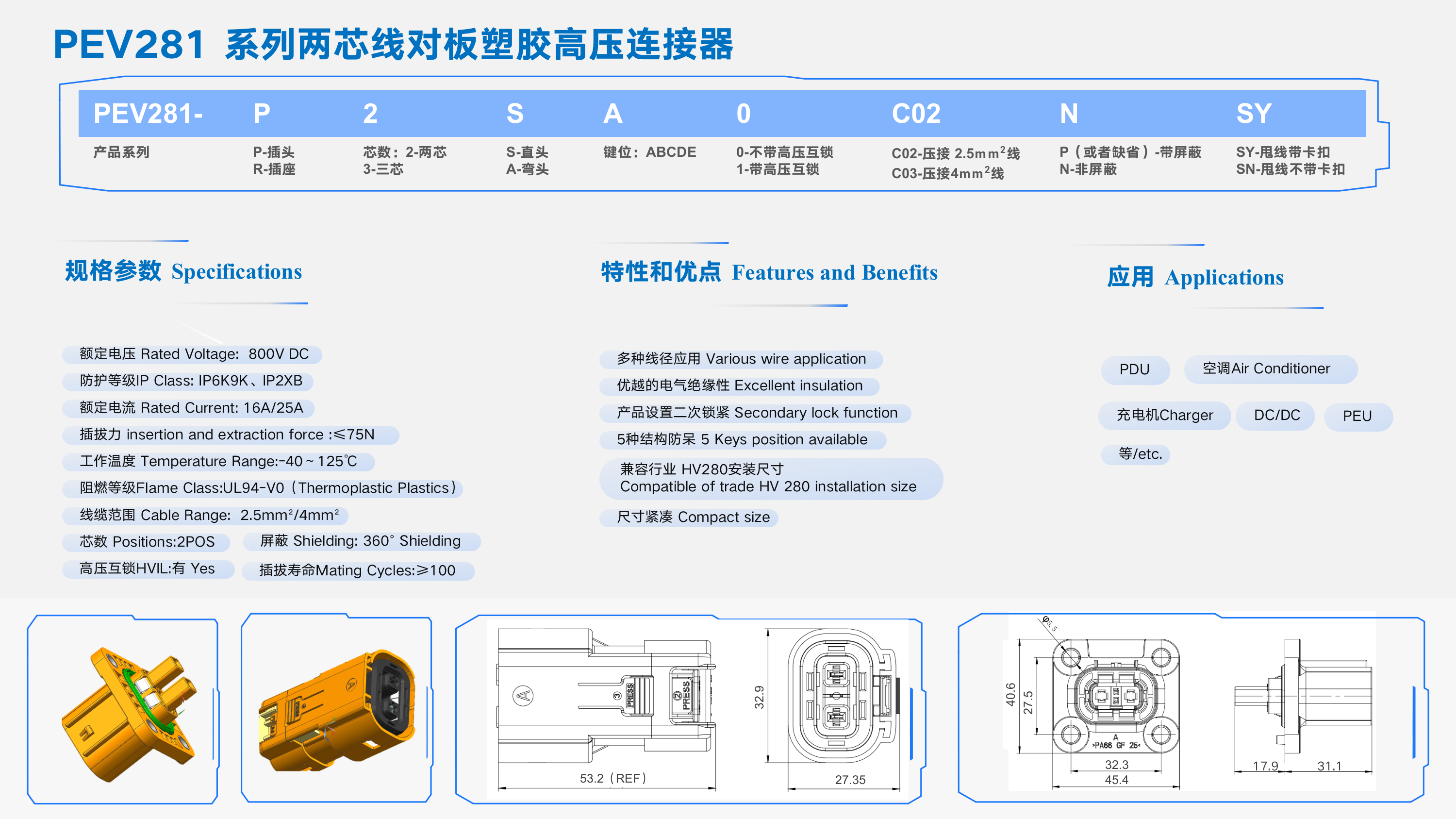 PEV281 系列兩芯線(xiàn)對板塑膠高壓連接器