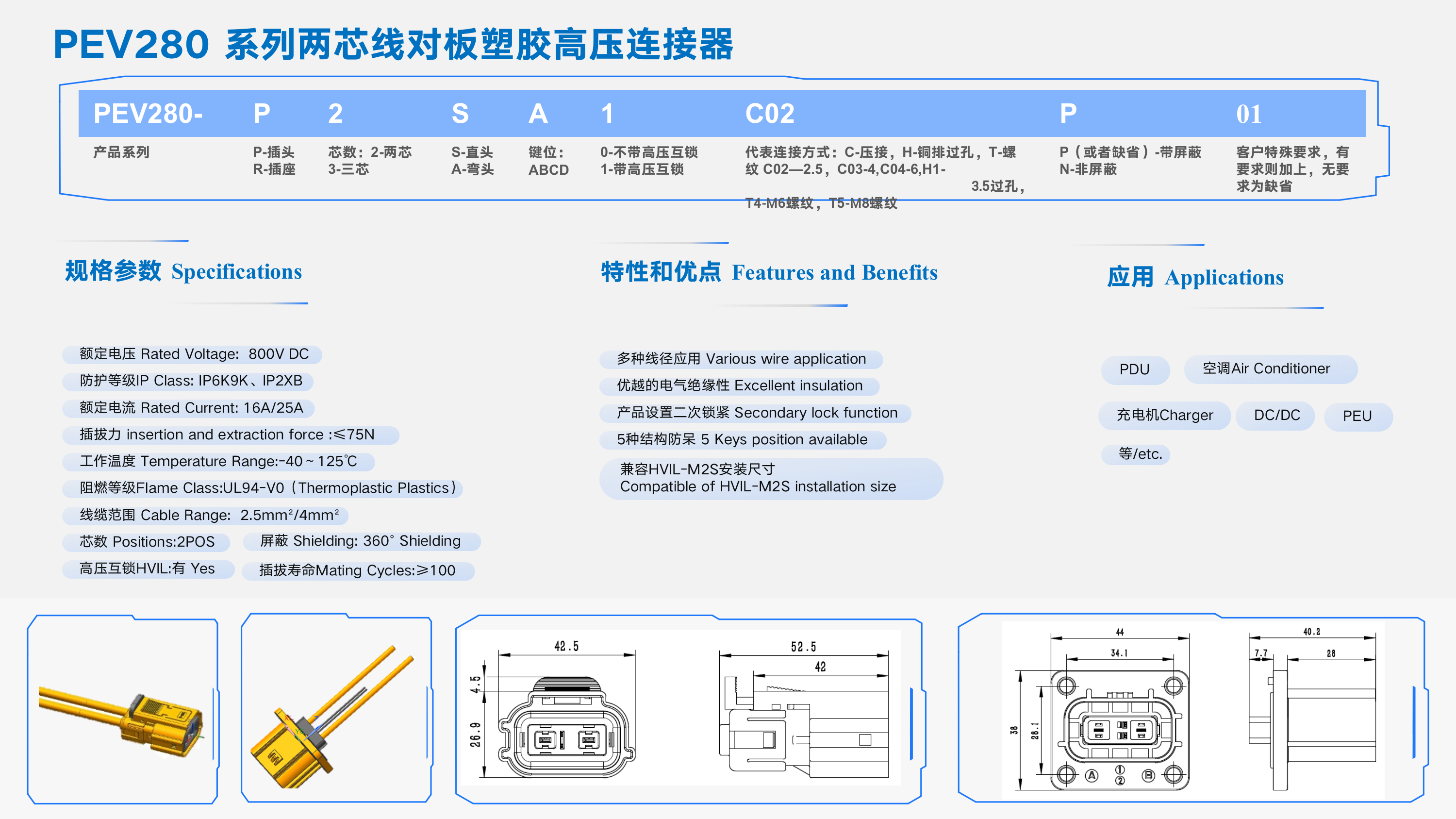 PEV280 系列兩芯線(xiàn)對板塑膠高壓連接器