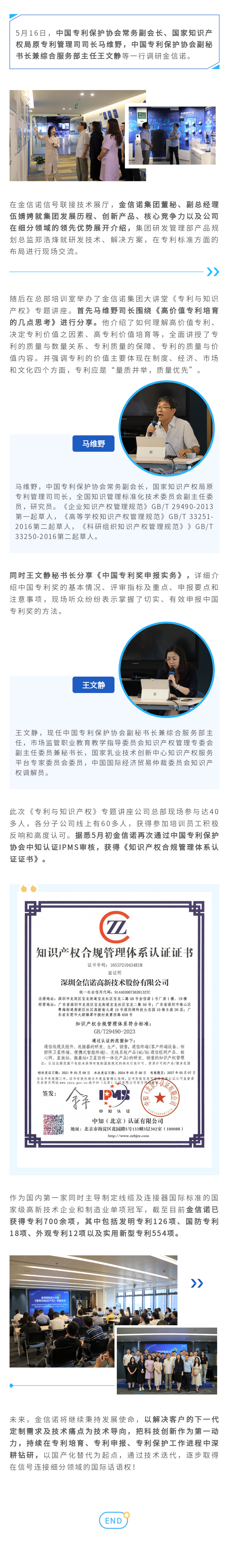 中國專(zhuān)利保護協(xié)會(huì )常務(wù)副會(huì )長(cháng)、國家知識產(chǎn)權局原專(zhuān)利司司長(cháng)馬維野一行調研金信諾并舉行專(zhuān)題講座