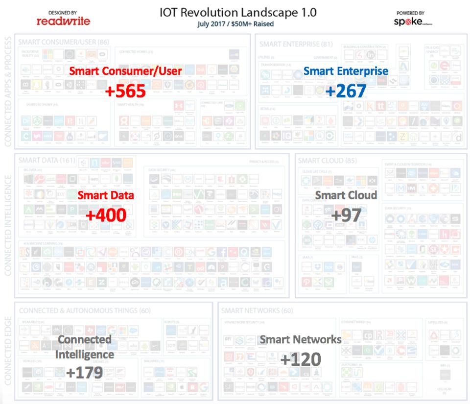 來(lái)自Spoke Intelligence和ReadWrite的統計顯示,截至2017年7月,北美地區有2888家物聯(lián)網(wǎng)相關(guān)企業(yè),其中有95家公司現在是獨角獸企業(yè),也即規模在十億美元以上的初創(chuàng )公司。其中近一半的公司都聚焦在五個(gè)領(lǐng)域:人工智能(AI)和機器學(xué)習(401家公司);智能家居(282家公司);健康醫療——企業(yè)(240家公司);促進(jìn)性現實(shí)VR/AR(216家公司);數據安全(208家公司)。